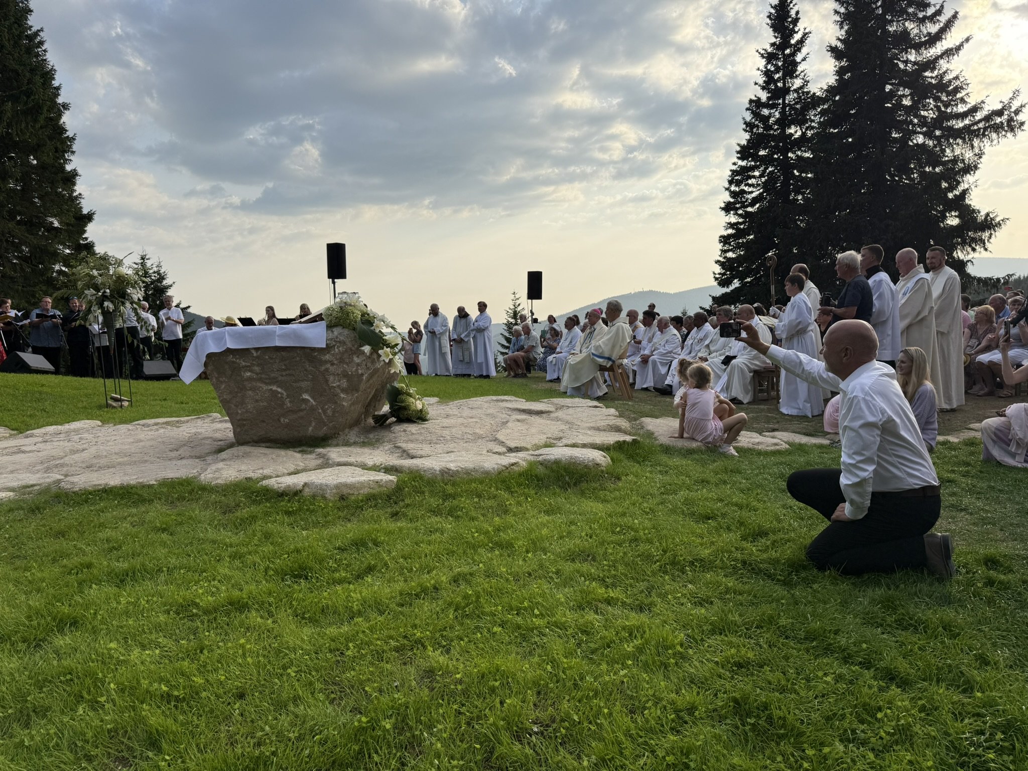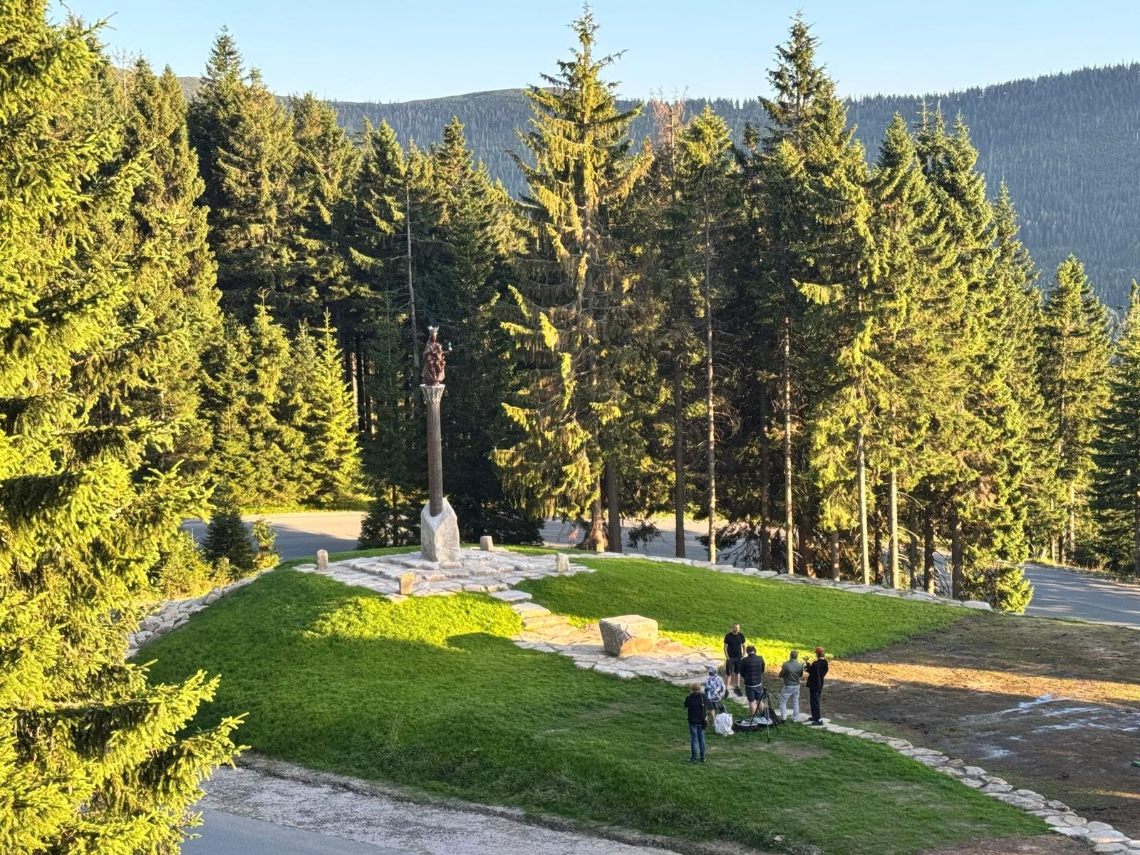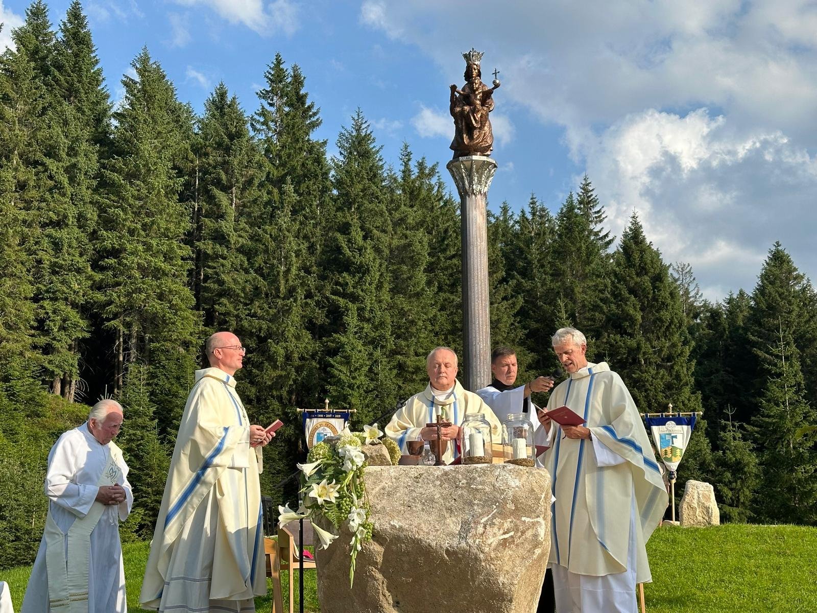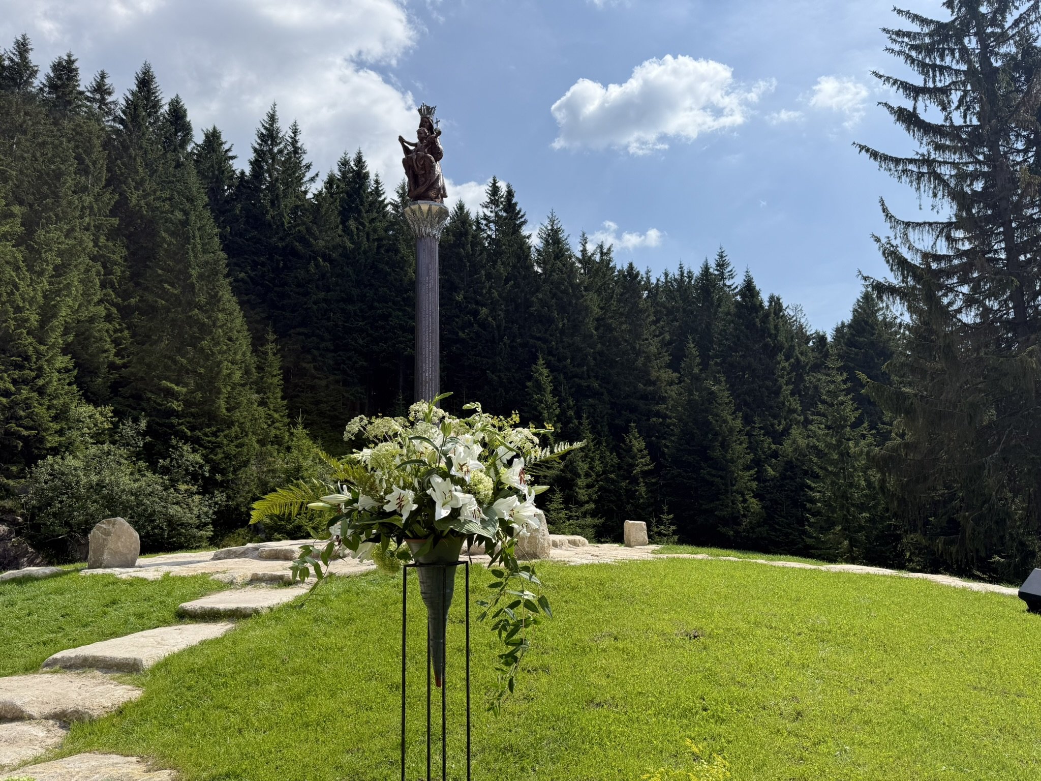 Sousoší v pondělí na sloup zaražený do žulového kamene umístila hydraulická ruka. Ještě předtím manželé Tomáškovi, kteří vlastní horský Resort sv. František s Erlebachovou a Josefovou boudou, vložili do nerezové schránky poselství příštím generacím. Kromě modliteb, vzkazů autora sochy Otmara Olivy, manželů Tomáškových a jejich přátel, letáku se jmény těch, kdo se na vzniku díla podíleli, je uvnitř projektová dokumentace sloupu, sada poštovních známek s Královnou hor, evangelia nebo kniha Příběh Erlebachovy boudy od historika Martina Bartoše. „Do schránky jsme vložili také knihy, které vydáváme ve spolupráci s různými odborníky a 1. lékařskou fakultou Univerzity Karlovy, aby tam také bylo svědectví toho, co se na tomto místě do roku 2025 dělo,“ prozradil Jiří Tomášek.
