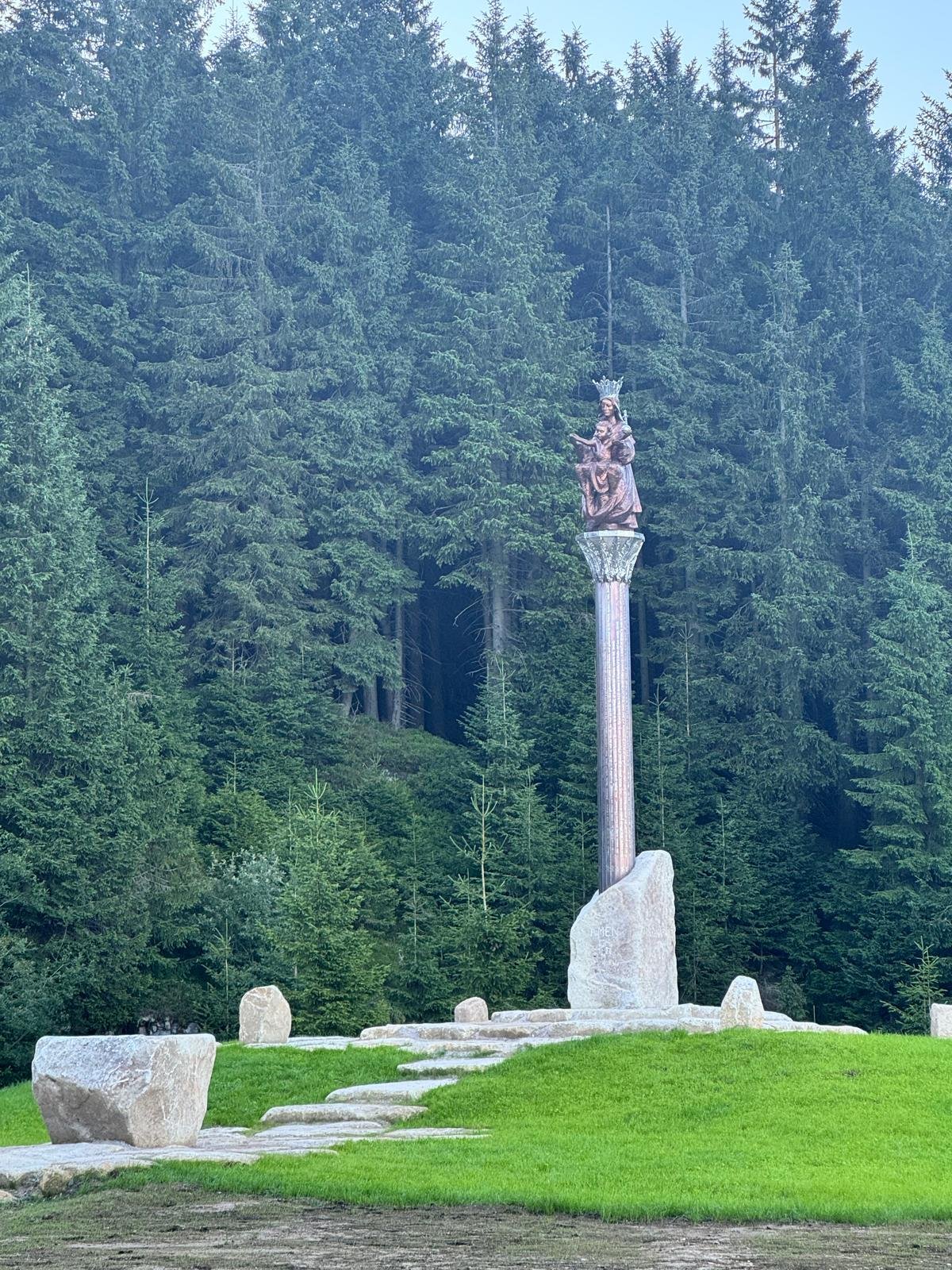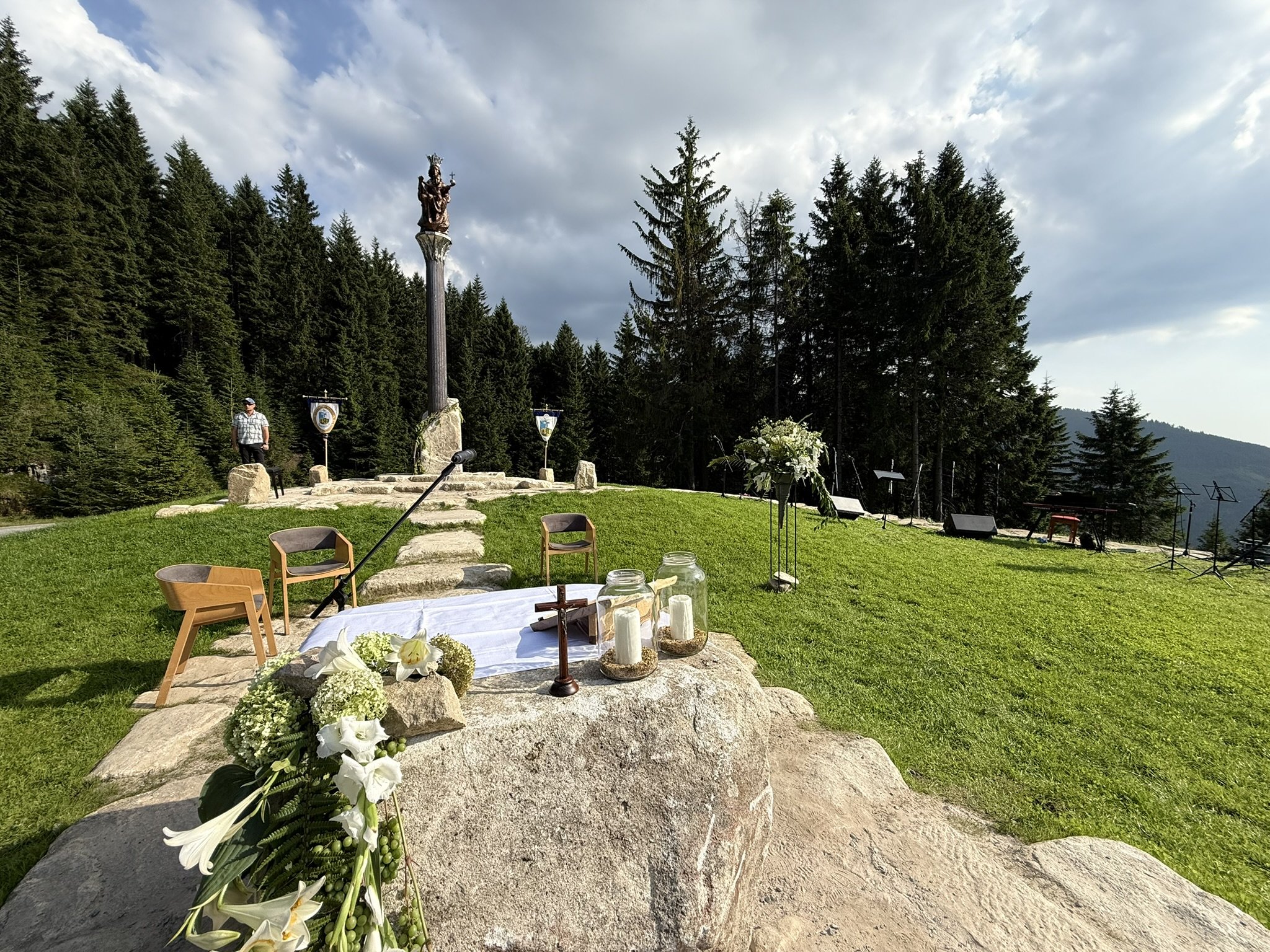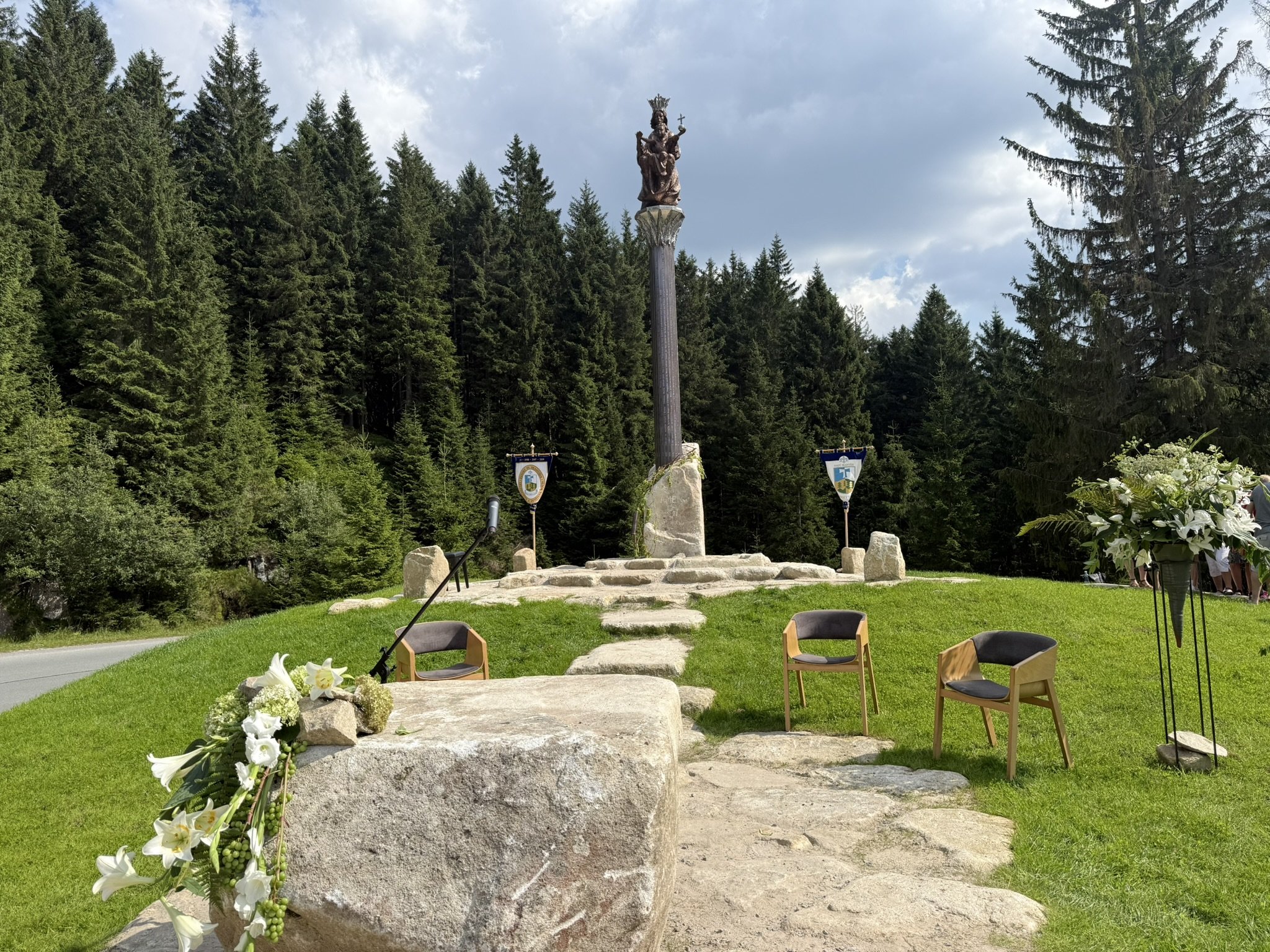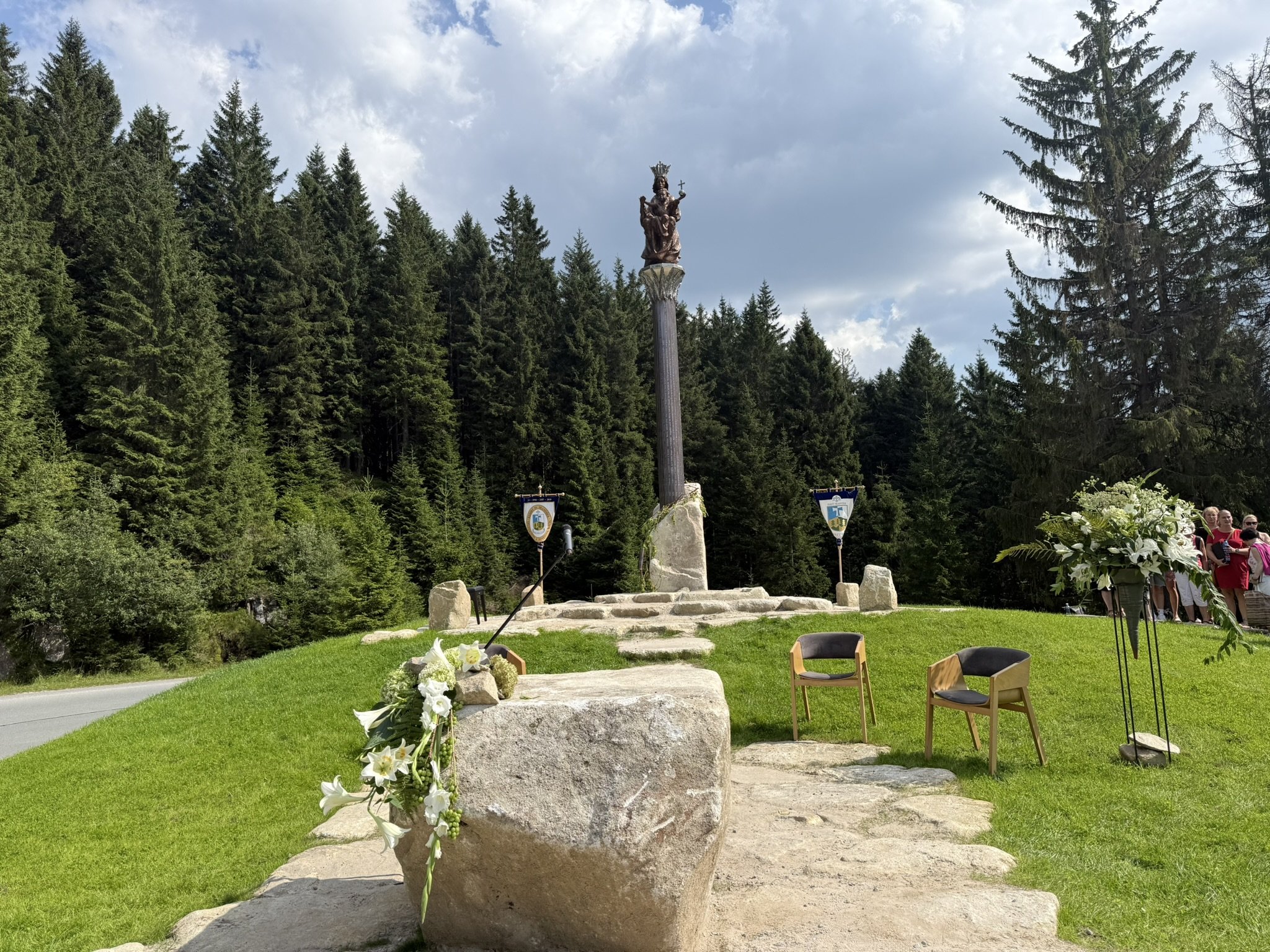 Osm metrů vysoký Mariánský sloup u Erlebachovy boudy v Krkonoších už je kompletní. Slavnostní odhalení se uskuteční v pátek. Manželé Tomáškovi projekt připravovali deset let.