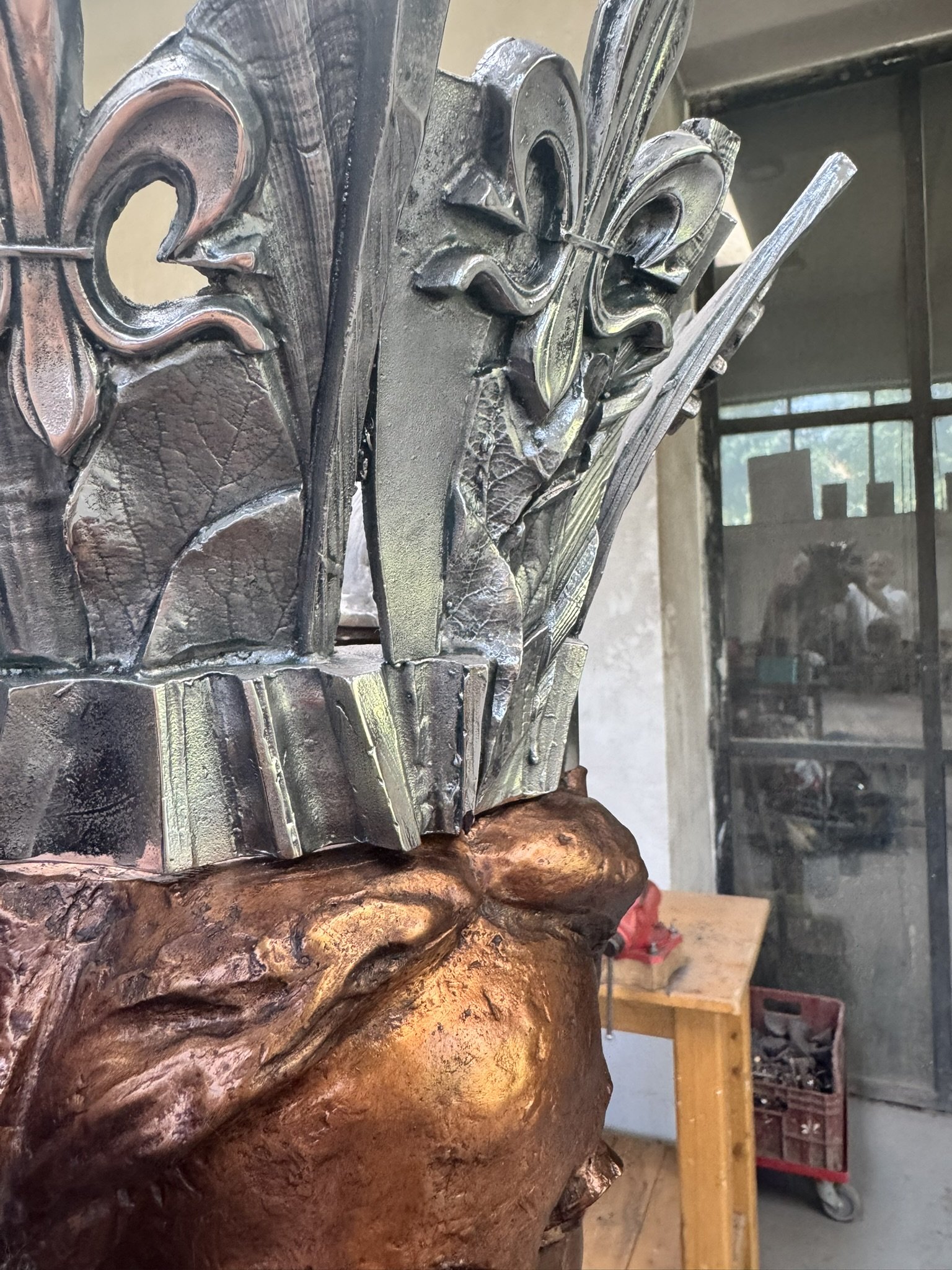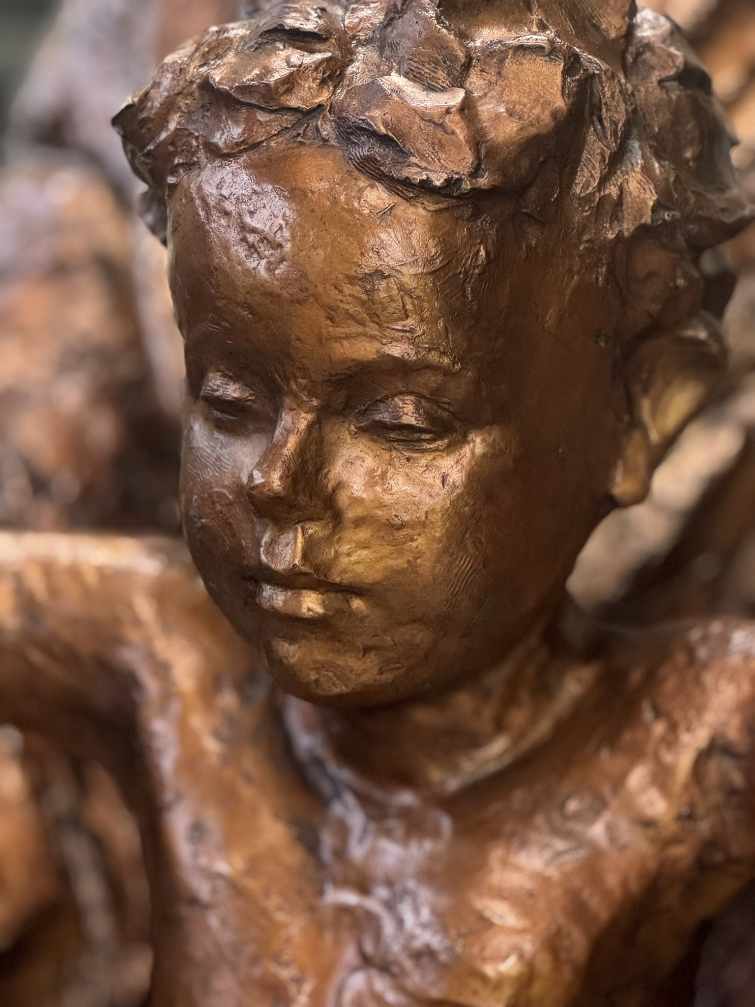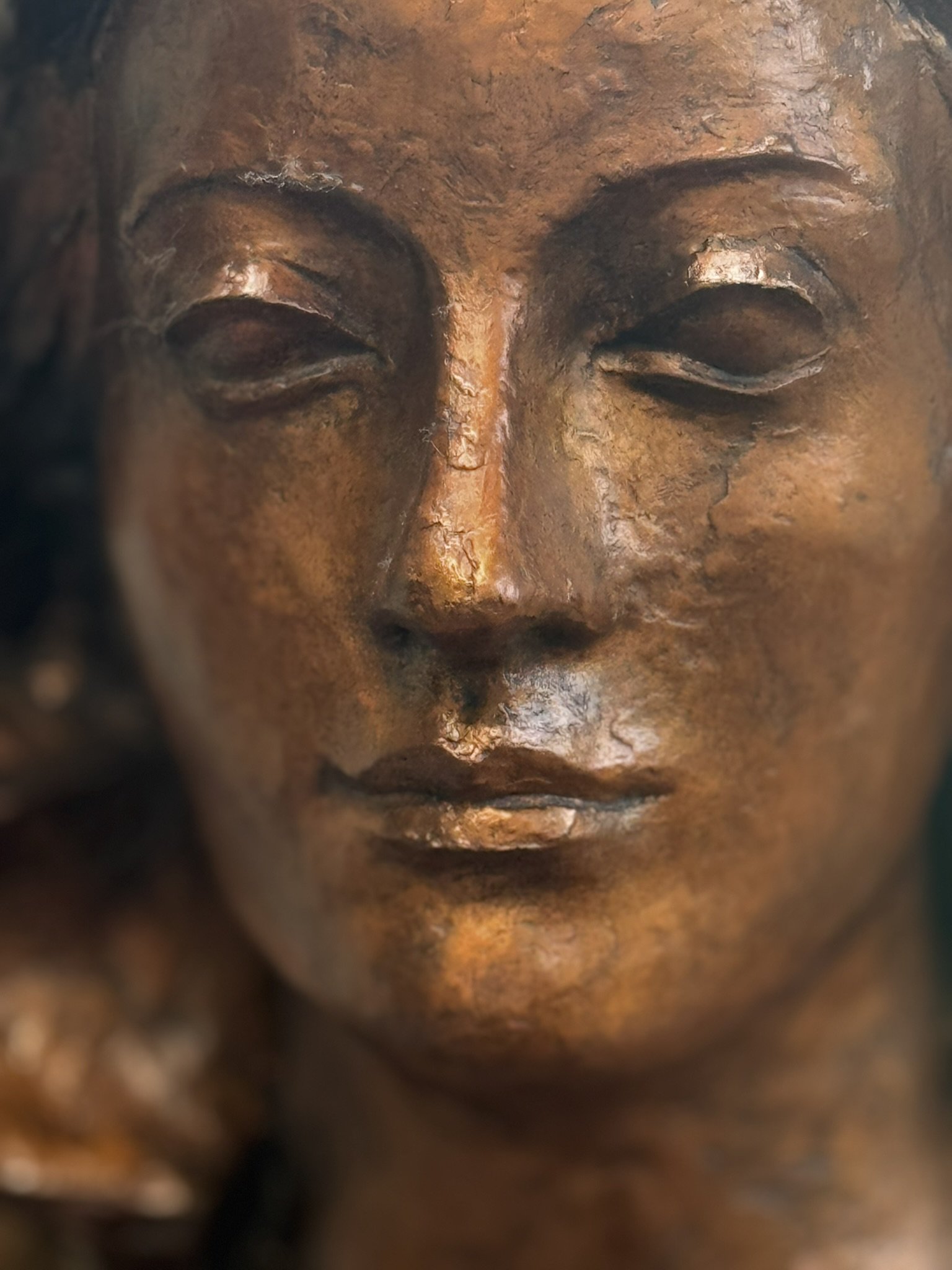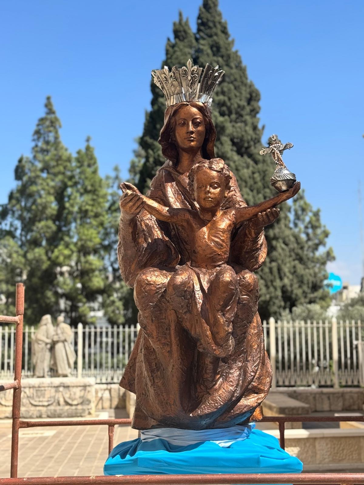 Celé místo je prodchnuté duchovními odkazy a náboženskými symboly, každá část má svůj význam. Ústředním tématem skulptury je dítě Kristus s ranou v boku, s rozepjatýma rukama, symbolizujícími kříž. Matka Boží v sousoší reprezentuje církev. Bronzová socha měří 178 centimetrů a váží kolem 300 kilogramů, koruna Panny Marie a říšské jablko jsou z nerezové oceli.